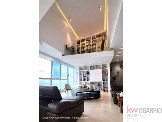 Amplio apartamento en piso alto con espectacular vista frontal al mar. Su diseño con doble altura y mezzanines le da una sensación de amplitud y estilo poco común, muy similar al concepto de un penthouse.